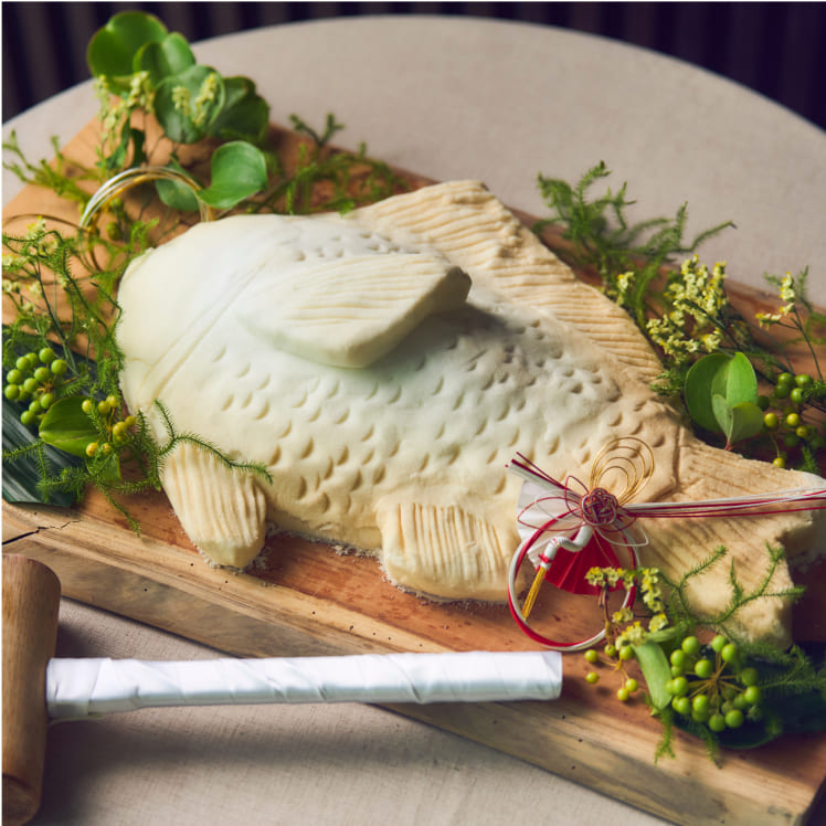 響 風庭 赤坂ではこだわりの料理を使用した演出も多数ご用意しています。天然の真鯛と使用した「鯛の塩釜開き」は自慢の石窯御飯と炊き上げて鯛めしとして提供することも可能。食材にこだわった響だからこそできる食のエンターテインメントをご提供します。