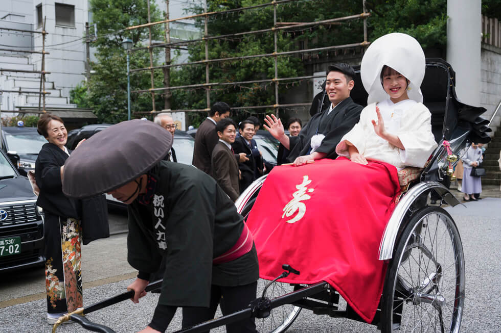 挙式は芝大神宮で厳かに、挙式後はゲストに見送られ、人力車で東京タワーを周遊する特別な時間をすごされました。